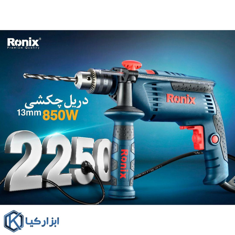 امروزه برای سوراخ کردن اجسام مختلف، از انواع دریلهای برقی یا شارژی استفاده میکنند. کار با این دستگاه کار چندان مشکلی نیست و نیاز به کسب مهارت خاصی ندارد. با توجه به میل افراد جامعه به انجام کارهای فنی در منزل، در بسیاری از خانهها نمونهای از این دستگاه دیده میشود. حتی بانوان هم میتوانند بهراحتی از این دستگاه استفاده کنند. دریلها انواع مختلفی دارند و انرژی موردنیاز خود را از برق یا باتری میگیرند. با استفاده از دریلهای معمولی قادر به سوراخ کردن اجسامی از جنس چوب، پلاستیک یا فلزات هستید. اما با دریلهای چکشی علاوه بر این موارد، دیوار، سرامیک و انواع مصالح ساختمانی را میتوانید سوراخ کنید. دریل چکشی رونیکس کد 2250 ابزاری مناسب برای سوراخکاری در انواع سطوح چوبی و فلزی است. حداکثر قطر سوراخکاری آن در چوب 20 میلیمتر و در فلز 13 میلیمتر و در مصالح نیز 13 میلیمتر است. این محصول از سیستم گردشی راستگرد و چپگرد بهره میبرد. این ابزار، امکان سوراخکاری در حالت معمولی و ضربهای را فراهم میسازد. منبع تغذیهی این دریل، برق شهری است و با ولتاژ ورودی 220 ولت کار میکند. توان خروجی این ابزار 850 وات است و میتواند با سرعت گردش تا 3000 دور در دقیقه به سوراخکاری بپردازد. برای سهولت در سوراخکاری، دستهای در قسمت جلویی دستگاه قرار دارد.